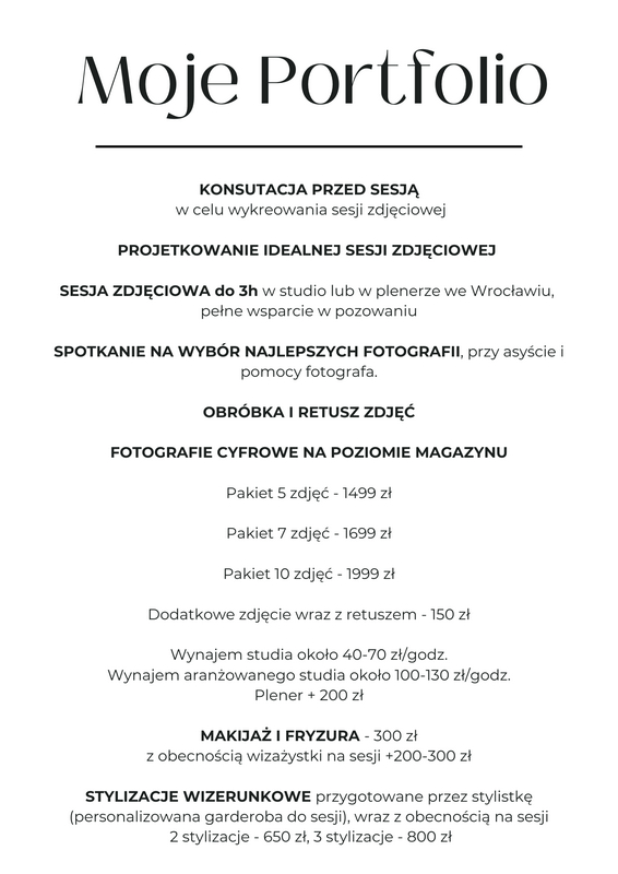- SESJA ZDJĘCIOWA w studio lub w plenerze we Wrocławiu. W trakcie sesji nauczymy Cię pozować i podpowiadamy jak się ustawić. Transport w miejsce sesji.